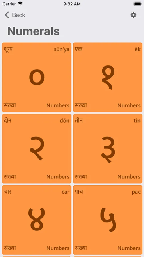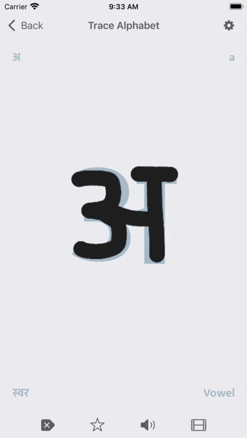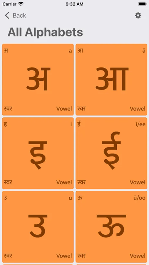 2. The Vowels section contains 12 Vowels of the Devanagari script. You can easily recognise and learn the pronunciation of each vowel.