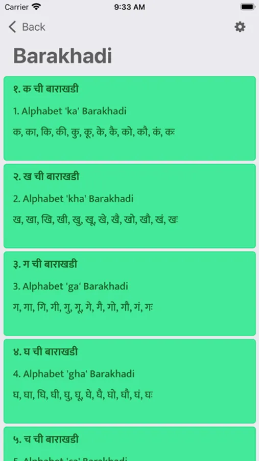 4. The Barakhadi section displays 410 Barakhadi Alphabets logically grouped in chunks for easy pronunciation. This is a great way to learn and understand the Devanagari script.