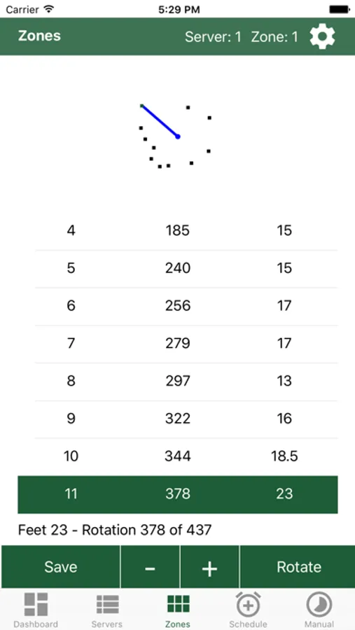 Press "Rotate" to point the water where you want (corner of lawn, edge of driveway, etc.), press plus or minus distance buttons till the water hits that point, then press "Insert" to save that direction and distance