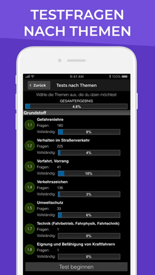 Prüfe dein Führerschein-Wissen in verschiedenen Themenbereichen. Du kannst dabei ein oder mehrere Themen und Tests mit 10, 20 oder 30 Übungsfragen auswählen.
