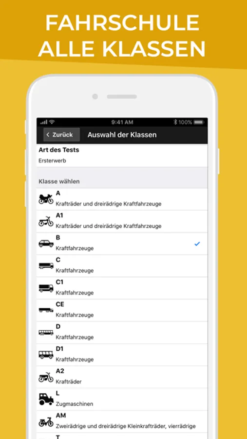 + Motorrad-Klassen: Klasse Mofa, Klasse AM, Klasse A1, Klasse A2, Klasse A.