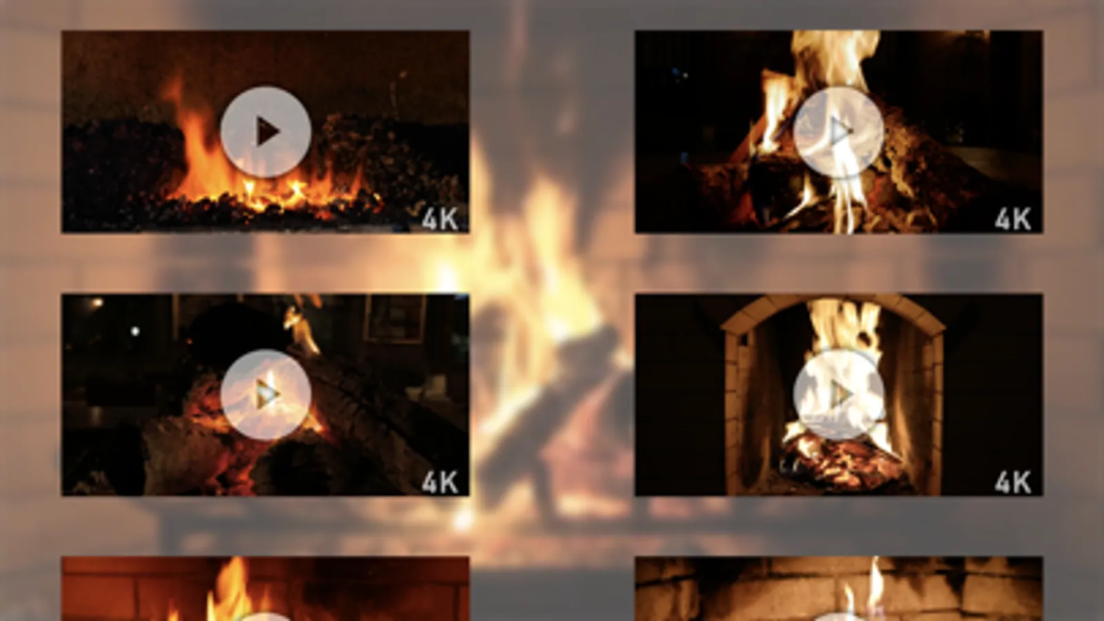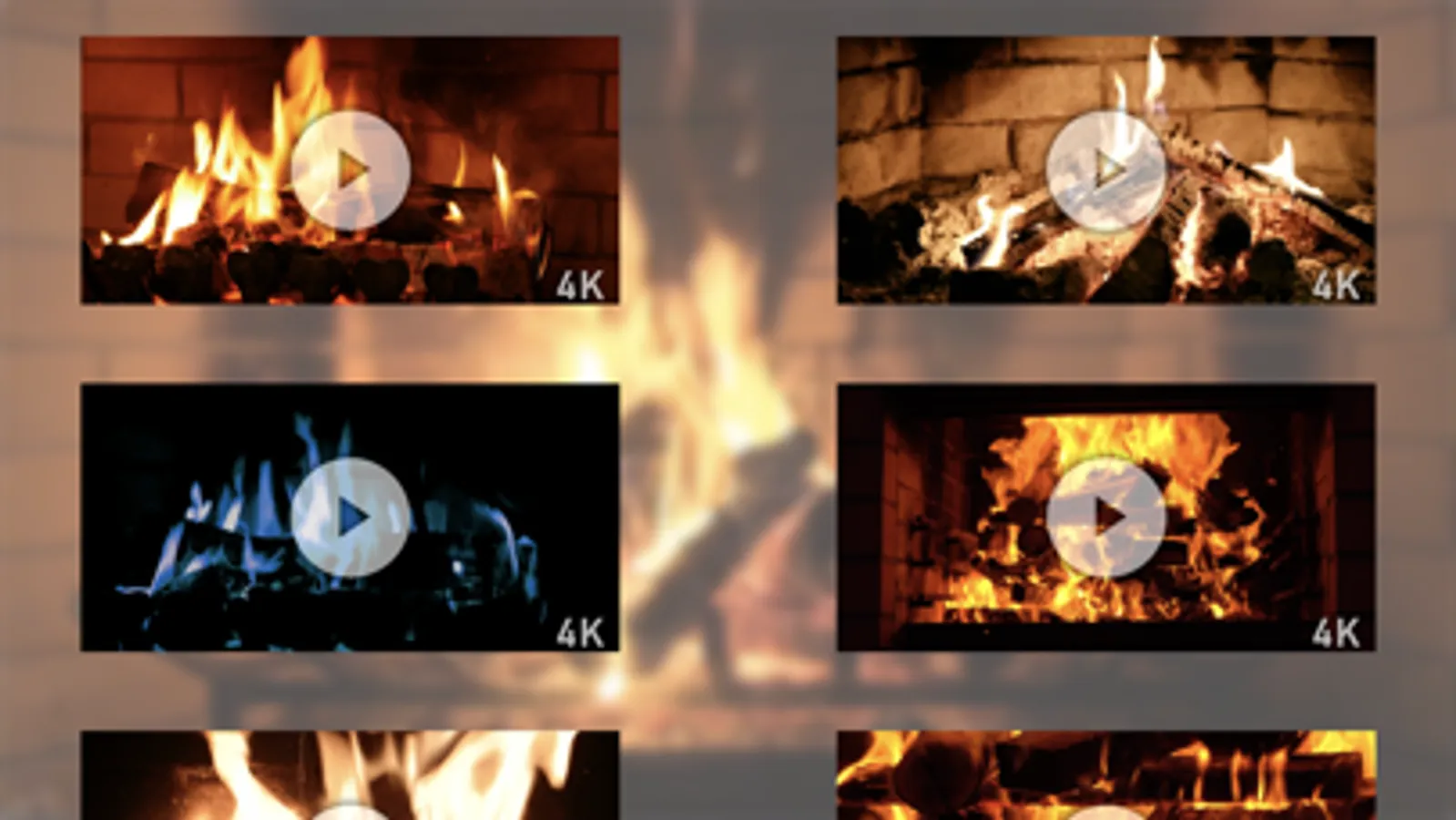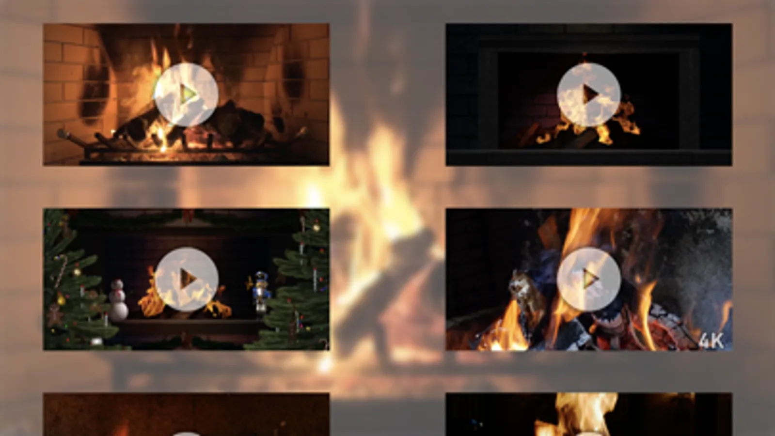 Winter Fireplace features 19 different fireplace scenes, with 15 of them in 4K resolution (all 19 are compatible with HD & 4K TVs).