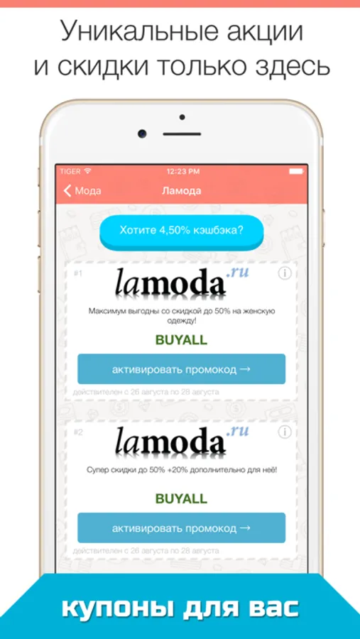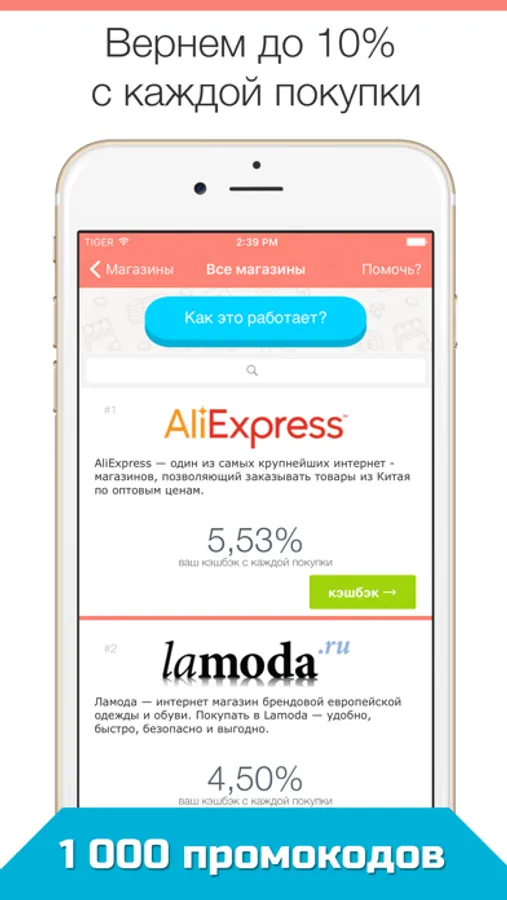 • Кэшбэк за покупки (Lamoda, Puma, Aliexpress, SuperStep, Nike, Adidas). Более 1000 брендов в 100 магазинах.