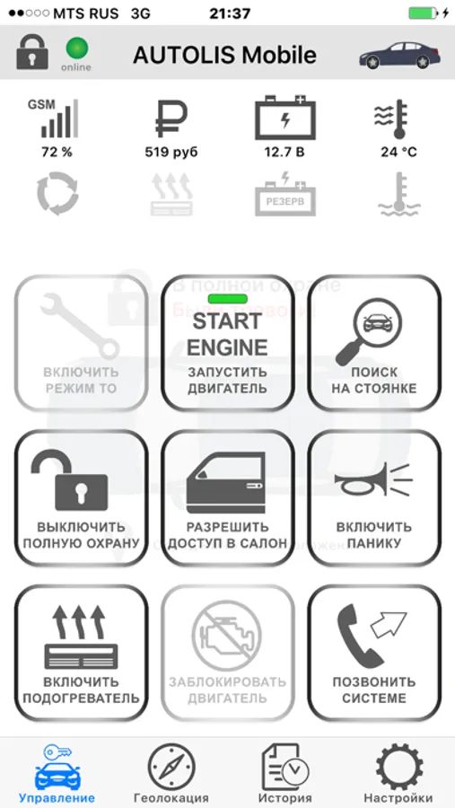 • Интерактивный контур автомобиля, на котором отображаются текущие тревоги и состояние двигателя в режиме охраны