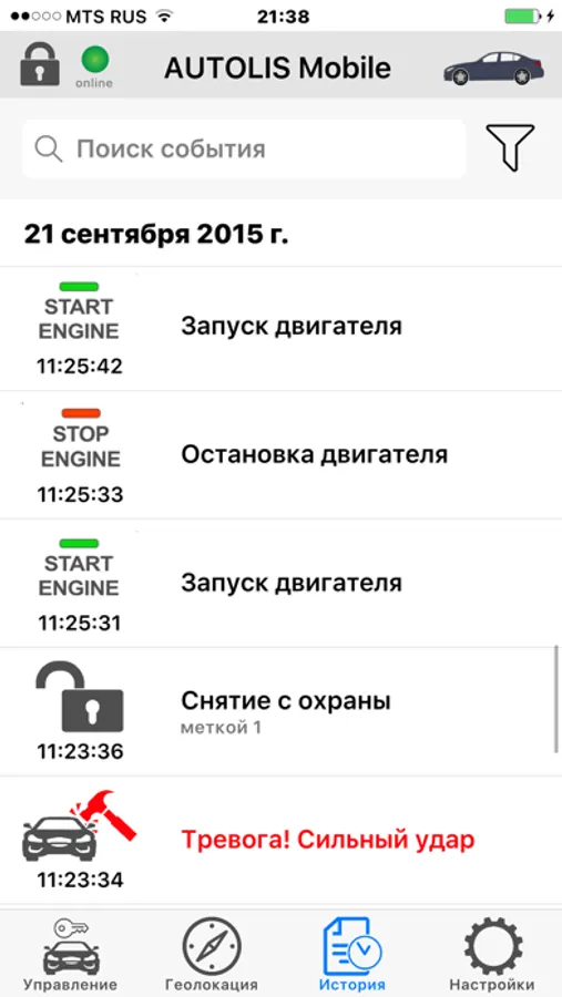В разделе история отображаются более 100 событий, зафиксированных системой, с указанием даты и времени, с точностью до секунды. Пользователь может использовать фильтр для выбора типа отображаемых событий и периода, за который эти события надо показывать: день, неделю или задать произвольный период. В разделе реализован быстрый поиск событий по наименованию.