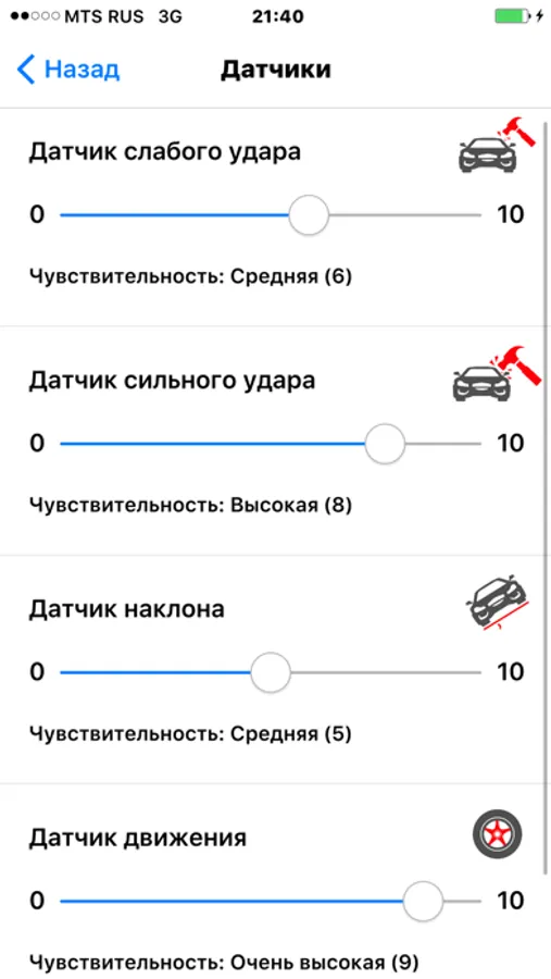 • настроить чувствительность датчиков системы