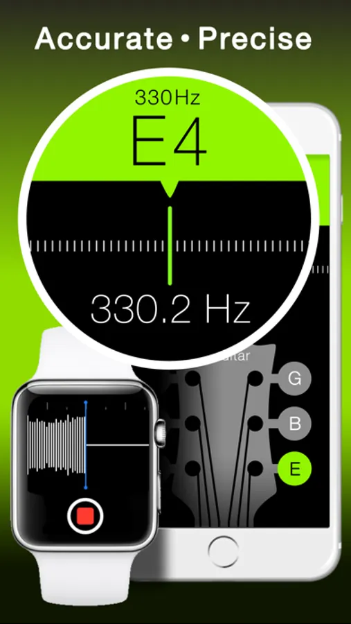 The 1st Apple Watch + iPhone Chromatic Tuner that detects and displays your tuning accurately and precisely .