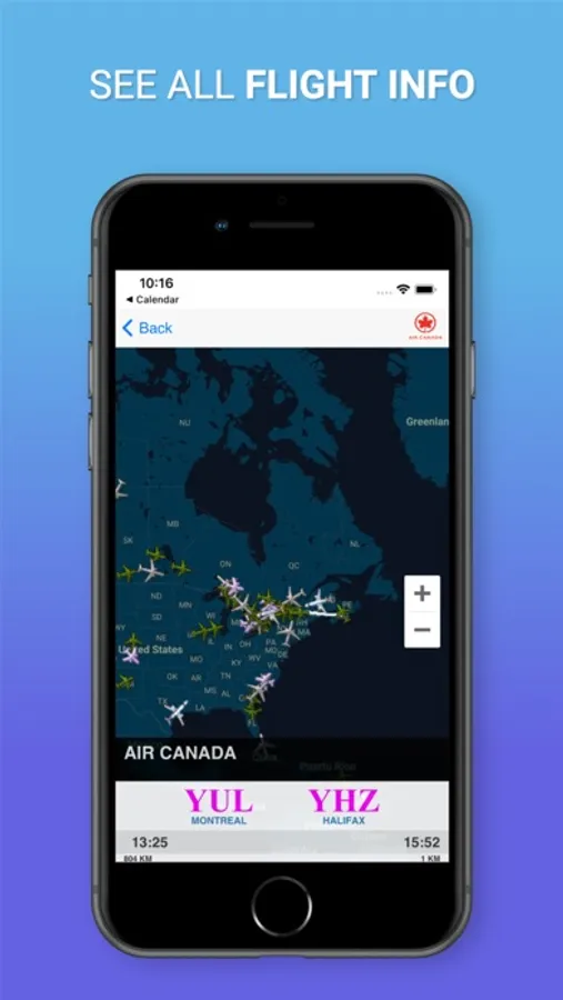Air CA lets you view whole flights with 100% correct and instant information. And if you wish, you can push the airports button and switch to another one you want or you can select an airline and view their whole flights in the sky!
