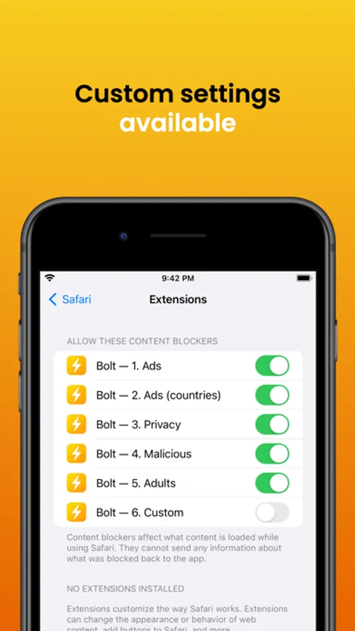 Bolt provides several filter lists. You are able to choose exactly what you want to block: ads, privacy trackers, adult websites, ...
