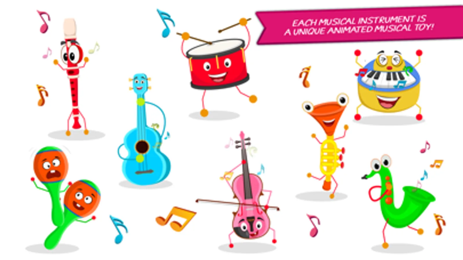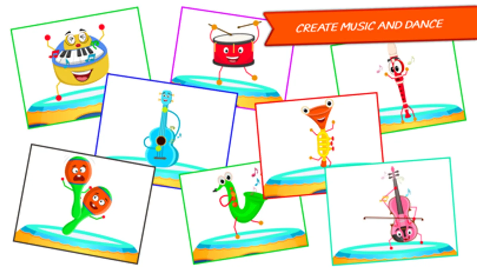 • 8 colorful instruments, each with their own unique sounds and dance!