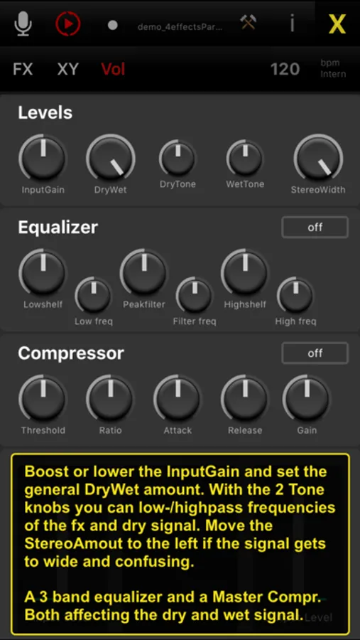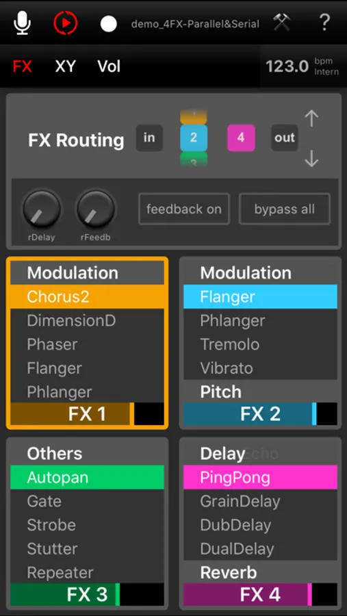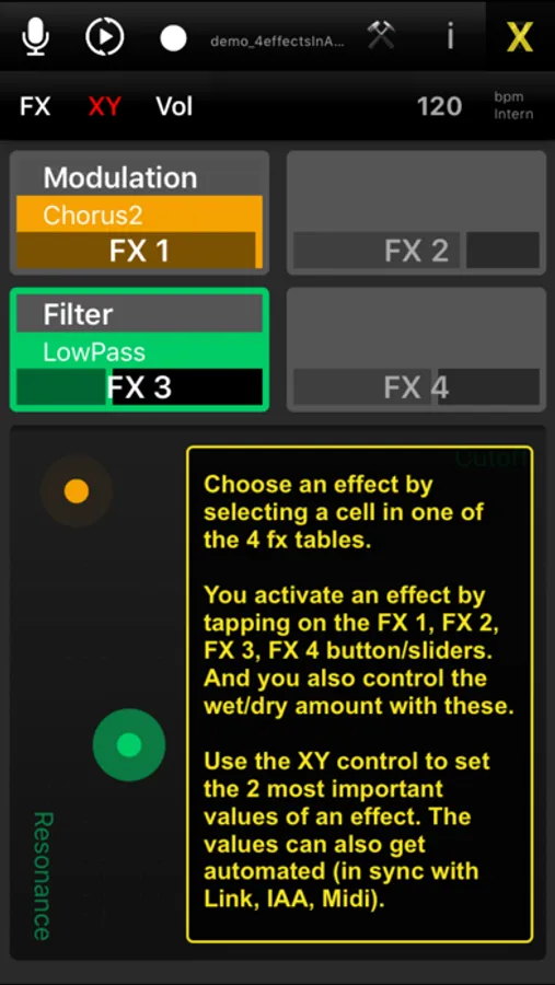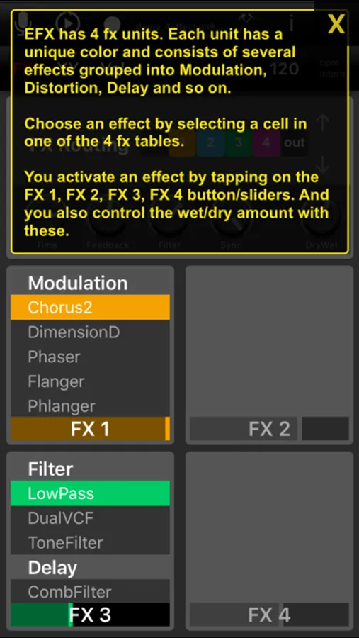 EFX is a 4 channels multi-effect processor, that's easy and intuitive to play, but offers complex options to shape the sound and to route the audio effects stream.