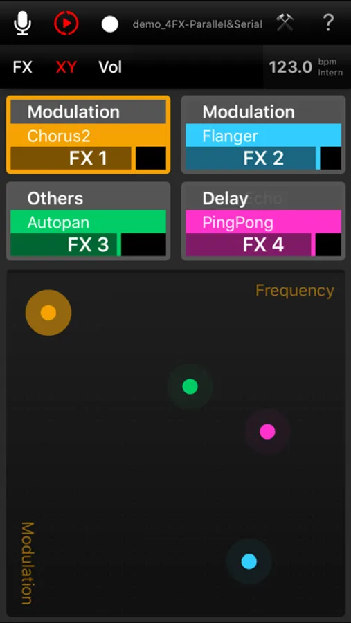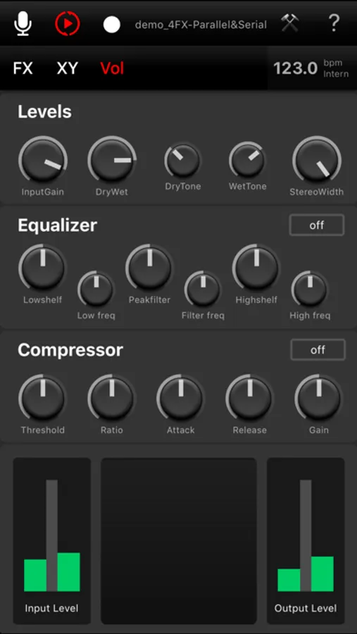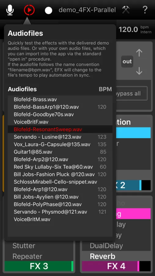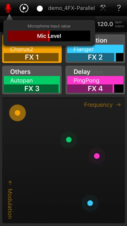 Connect EFX to any input source, like the devices built in microphone, an external keyboard or guitar (iPad soundcard needed) or to your favorite iOS drum machine or synthesizer via Inter-App Audio or Audiobus. Or import a soundfile into the app and alienate it with with up to 4 different effects at the same time!