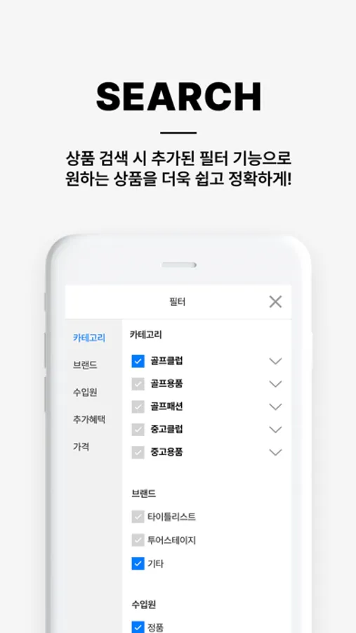 클럽부터 용품, 의류, 해외직구대행, 골프존 스크린골프 결과값을 반영한 피팅샵까지