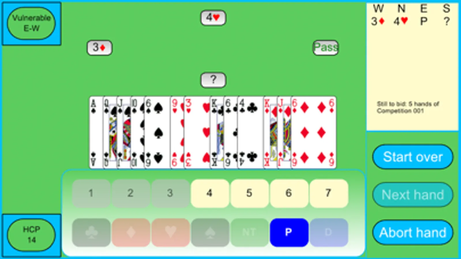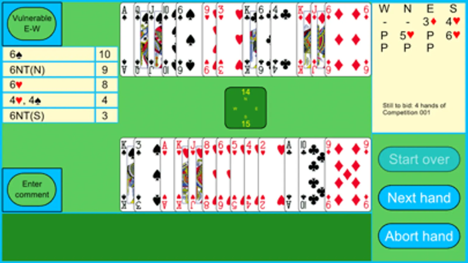 With the Bidding Contest you can bid up to 1000 hands according your own bidding system. It is not important how you bid; the only thing that counts is the result. After the auction is finished you will see your score and what the the best contract is.