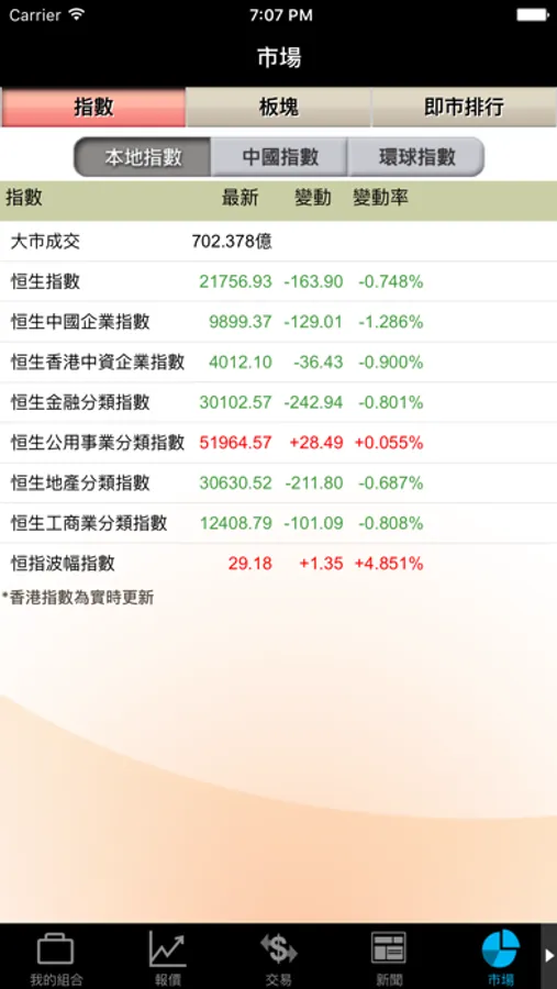 「市場資訊」- 最新市場資訊包括 : 各地指數、20大表現股票及最新派息。