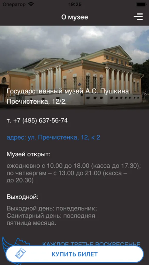Мобильное приложение является интерактивным музейным гидом по зданию Государственного музея А.С.Пушкина и его филиалов: Мемориальной квартире А.С. Пушкина на Арбате, Мемориальной квартире А. Белого на Арбате, Музею И.С. Тургенева на Остоженке, Дому-музею В.Л. Пушкина на Старой Басманной и Выставочному залу в Денежном переулке.