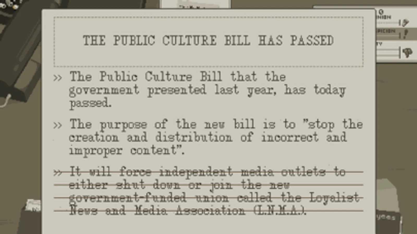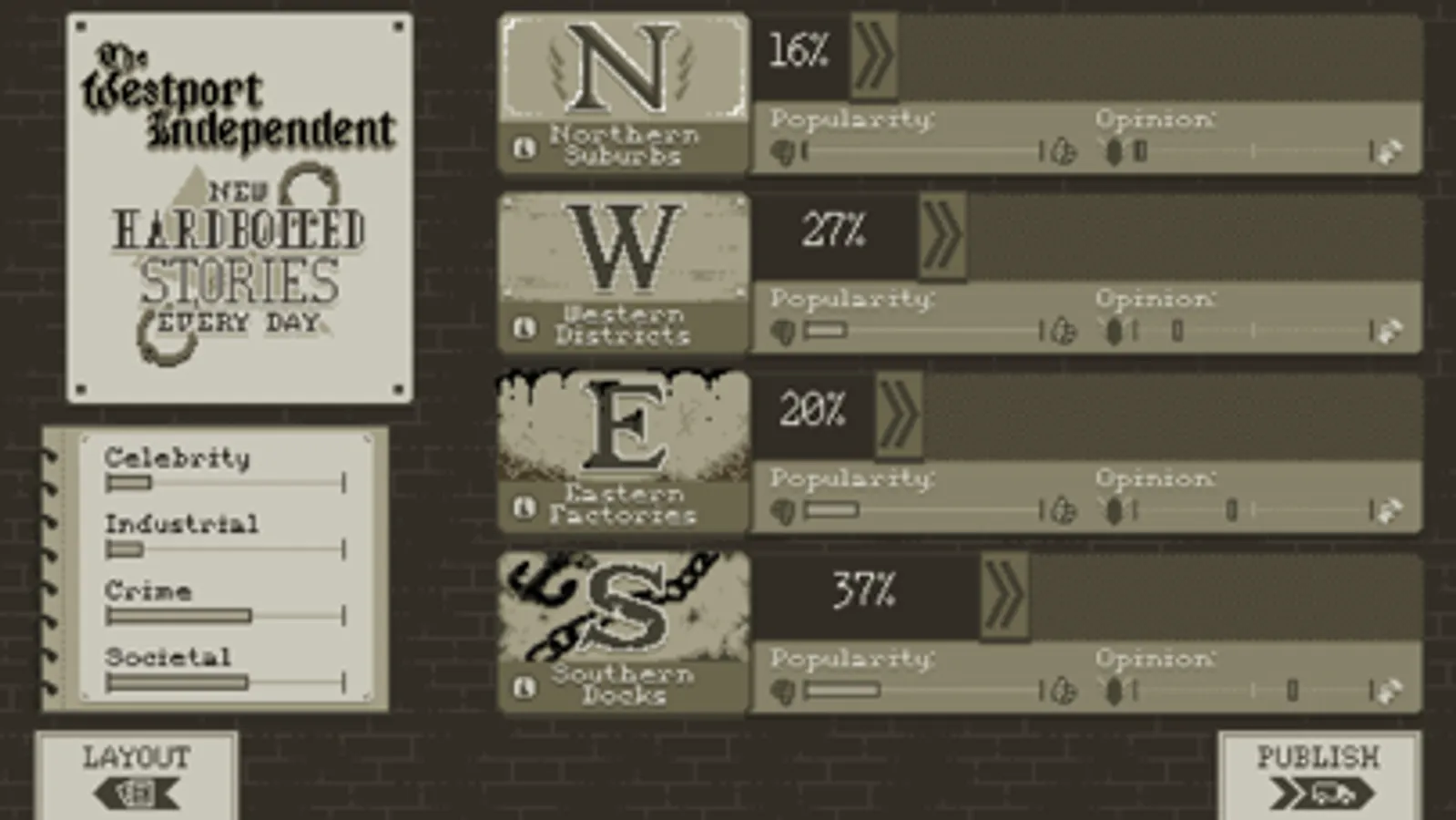 The Westport Independent is a censorship simulator taking place in a post-war country, governed by the recently elected Loyalist Party. As the editor of one of the last independent newspapers in the country, your job is to remove and edit the content of your paper, affecting the people’s opinion of both the rebels and the Loyalist government. With an increase of rebel activity and an ever watching government breathing down your neck, whose truth will you print?