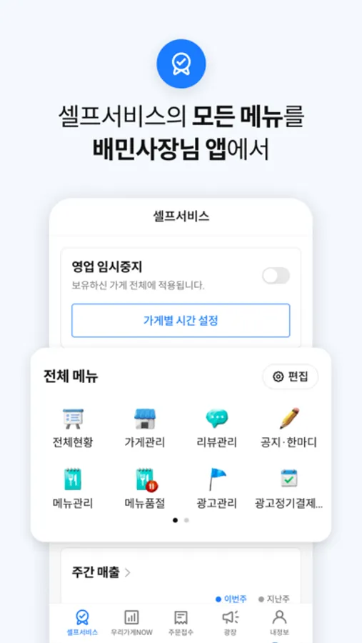 - 배민사장님앱에서 셀프서비스의 모든 메뉴를 이용해 보세요. 메뉴관리, 임시중지 이외에도 다양한 셀프서비스 기능을 이용할 수 있어요.