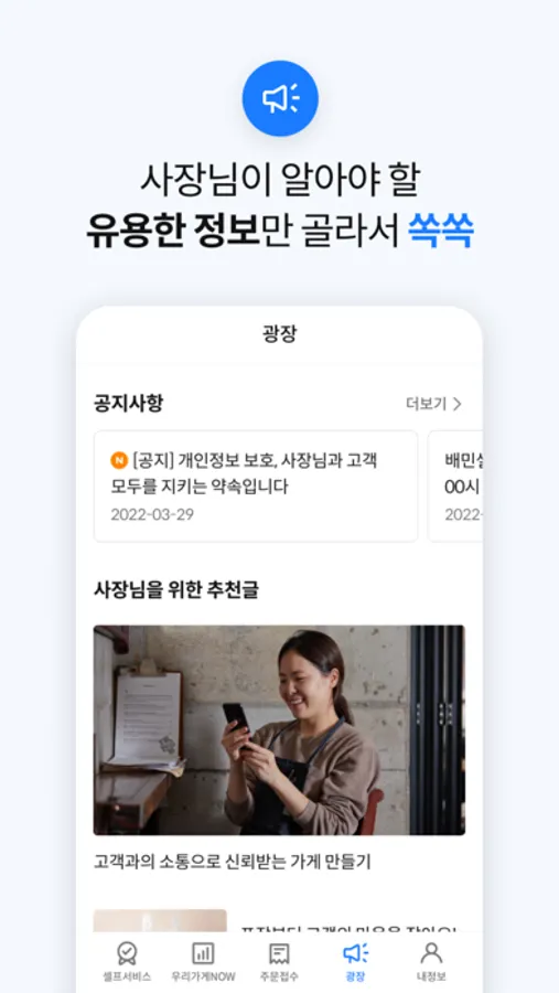 - 사장님들이 알아야 할 유용한 정보만 골라서 쏙쏙, 배민사장님앱 광장 메뉴에서 사장님에게 필요한 공지사항과 정보를 확인하세요.