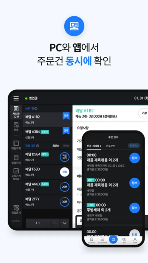 - PC 접수채널(배민주문접수 PC/PC 주문접수)과 멀티채널로 사용하시면 주문이 연동되어 어떤 채널에서라도 주문내용을 확인하고 처리할 수 있습니다.