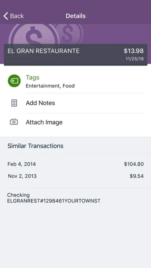 Add Tags, Notes, Images & Geo-Information: By enhancing transactions with custom tags, notes or photos of a receipt or check, you have the ability to stay organized and find exactly what you’re looking for when searching through your finances.