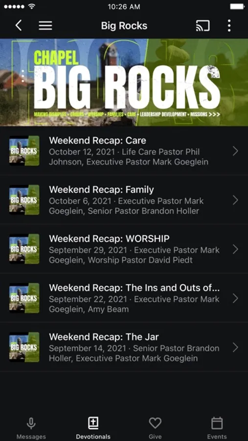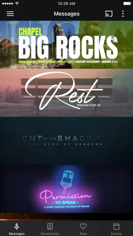 Welcome to The Chapel's official app! You can instantly watch or listen to any weekend message on the go! Never miss a Chapel event and customize your notifications to fit what areas most interest you. Also, the app highlights featured videos, weekly devotionals, Bible reading plans, and much more!