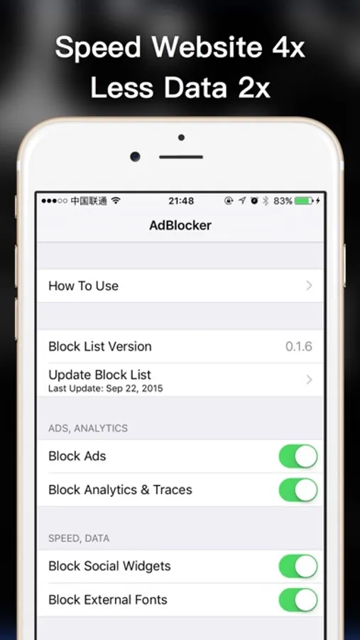 AdBlocker(Pro) is an ads-blocking app specially designed for iOS 9 which adopts the newest ads-blocking tech in iOS 9. With single tap, AdBlock is capable of blocking various ads, protecting your privary, speeding the websites with less data cost, improving the experience of browsing the internet.