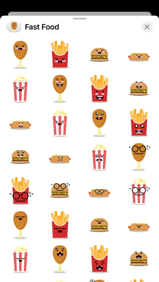 A fast food emoji pack featuring chicken, french fry, hamburger, hotdog, popcorn facial expressions including: smile, cry, angry, sad, confused, and many more.
