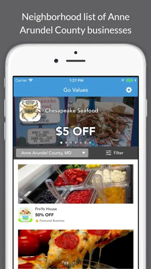 Discover new Anne Arundel County businesses and also get access to digital rewards cards from your favorites. Use Annes Arundel County's Premier Savings and Rewards App to help you find new places to eat and shop. GO VALUES contains pleanty of the local businesses you visit on a regular basis: restaurants, pizzerias, bakeries, ice cream shops, car washes, dry cleaners, hair salons, local professionals, home imnprovement and many great retail shops!