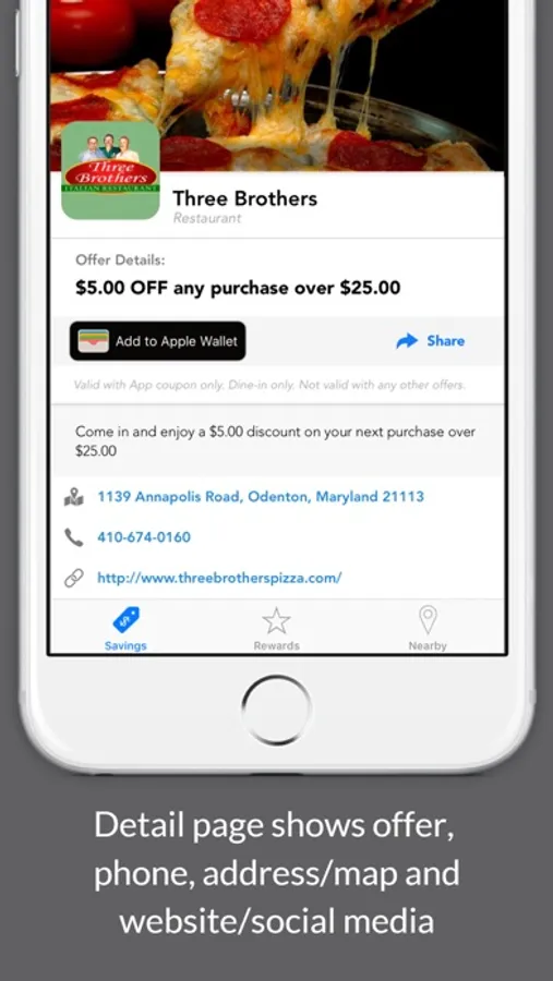 The Coupons and Rewards Cards you saved appear automatically on your phone when you enter the merchant's business. Redeem your coupons and earn rewards points right from your phone. Simply tap 'Save offer' and 'ADD' it to your Apple Wallet. Easy to use, nothing else to carry as all of the merchants' Coupon Passes and Rewards Cards are in your GO VALUES app. Each merchant's detail page conveniently contains quick access info. A simple tap on your phone screen allows you to call the merchant, see their location on your map or visit the merchant's website or social media.