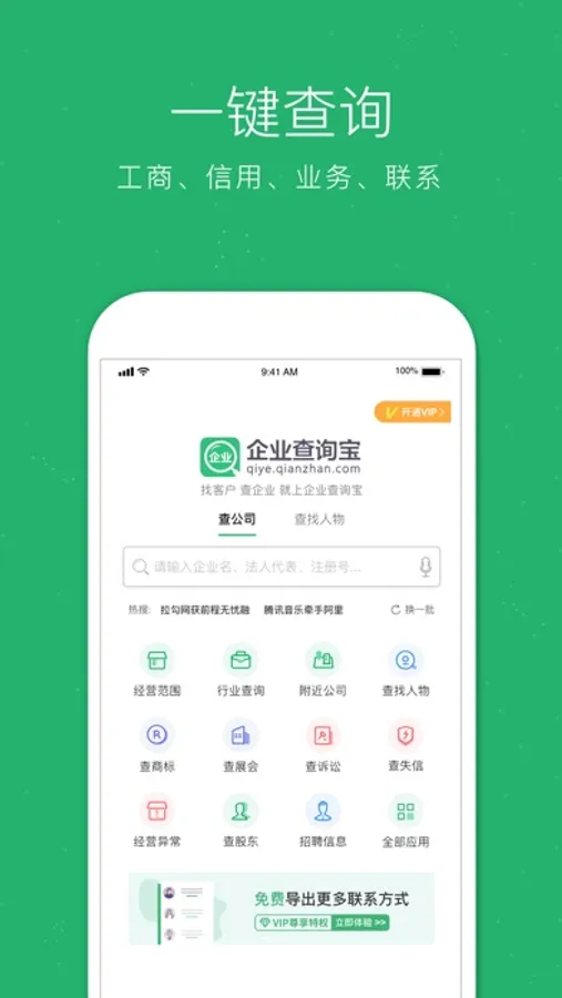企业查询宝是一款可以快速查询企业和企业老板工商背景信息的强大商业支持工具。覆盖全国1.6亿+企业信息,为用户提供全面有效的企业大数据查询。只要输入需要检索的企业名或人名,就可快速查到企业的工商信息、联系方式、股东高管、股权结构、对外投资、商标专利、法院诉讼、信用状况、关系图谱等。
