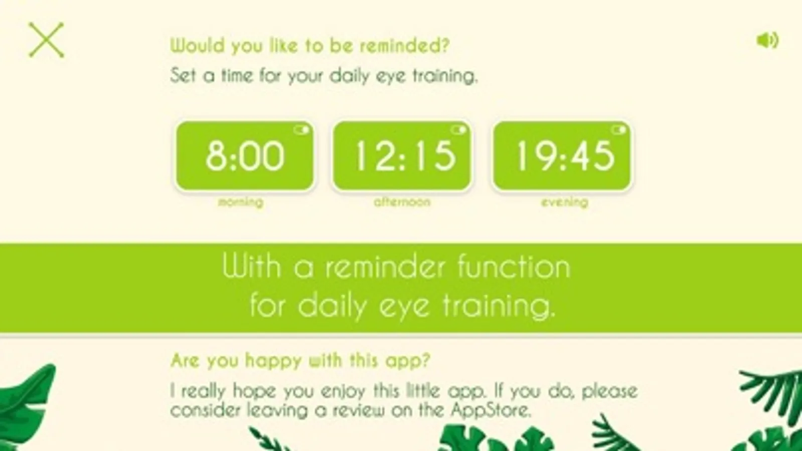 Even a short 5 minute workout in the morning, at noon and night relaxes not only your eyes and eye muscles - it can help you maintain good eyesight and, with regular training, even improve it. The 14 exercises in the workout are beautifully illustrated and animated - in addition there are 14 small tasks that can benefit healthy eyesight and 14 exercises for lazy eyes ( Amblyopia, Exotropia & Esotropia available with 3 background patterns).