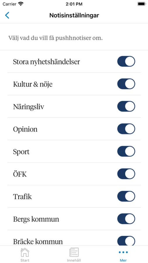 • Välj ett eller flera områden du är intresserad av så får du nyhetsnotiser när något händer i dina områden. Till exempel hemma, på jobbet, i stugan eller vid barnens skola.