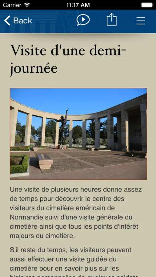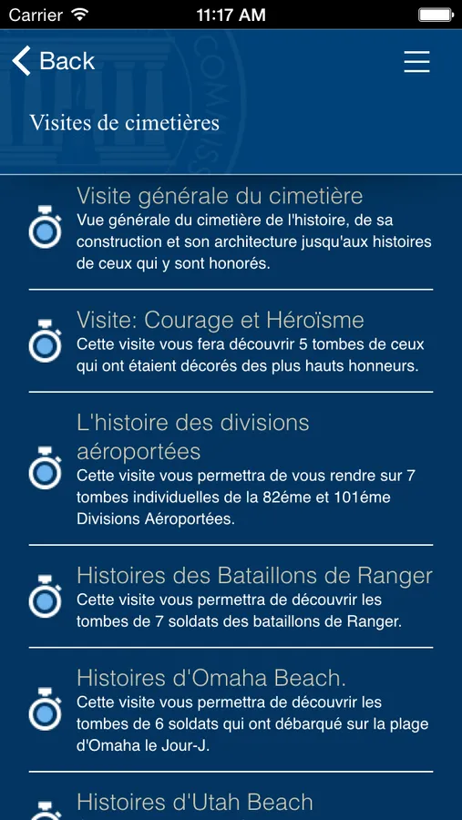 Explorez le cimetière américain de Normandie, où 9 387 soldats américains sont inhumés dans les terres sacrées qui surplombent Omaha Beach. Le 6 juin 1944, Jour J, les forces alliées changent le cours de l'histoire en participant à l'invasion réussie de la France, qui marquera le début de la fin de la Seconde Guerre mondiale en Europe. Ce guide personnel que constitue cette application officielle du cimetière américain de Normandie, vous permettra de découvrir le parcours des Américains qui y sont inhumés, d'explorer le cimetière, de comprendre le rôle que l'armée américaine joua pendant la Seconde Guerre mondiale, etc. Servez-vous de cette application au cimetière, ou par océan interposé. Nul besoin d'être en France pour tout apprendre sur ce site légendaire de la Seconde Guerre mondiale.