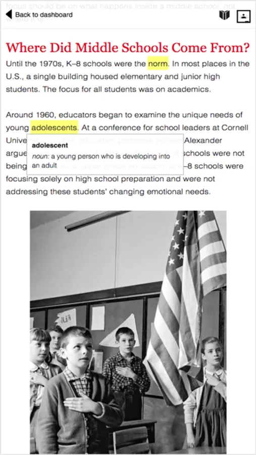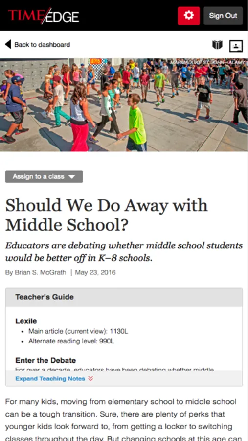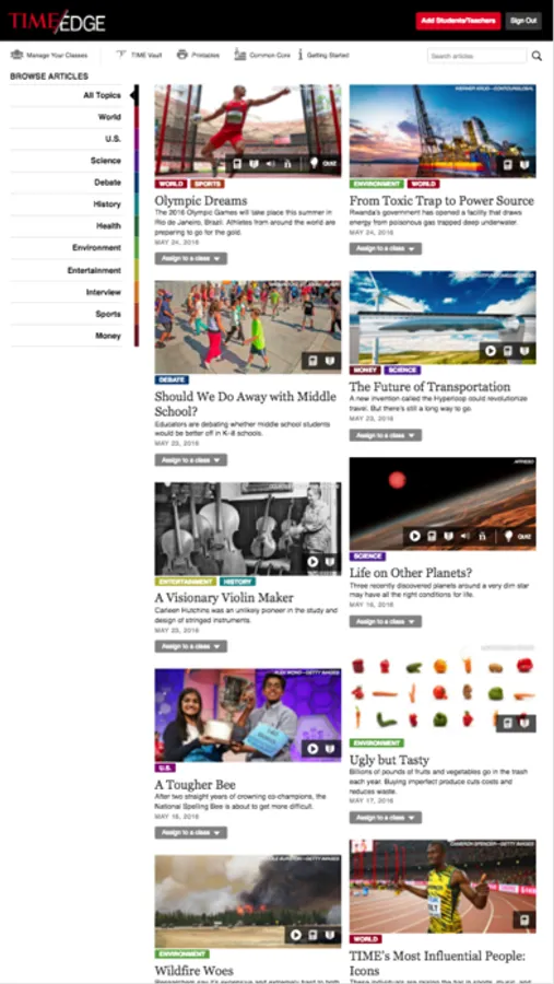 TIME Edge is a digital resource that brings relevant current events and primary sources to middle school classrooms. All of our content is written by the editors of TIME and TIME For Kids and geared specifically for use in classrooms. Our teacher resources are designed to support the mastery of the Common Core State Standards for English language arts as well as state and national standards for social studies and science classrooms. Teachers and students can access robust content online anytime from any device. From engaging nonfiction text and a 90-year archive of primary sources to formative assessments and close-reading assignments, TIME Edge has everything your classroom needs all in one place. Try it with your class free for 60 days!