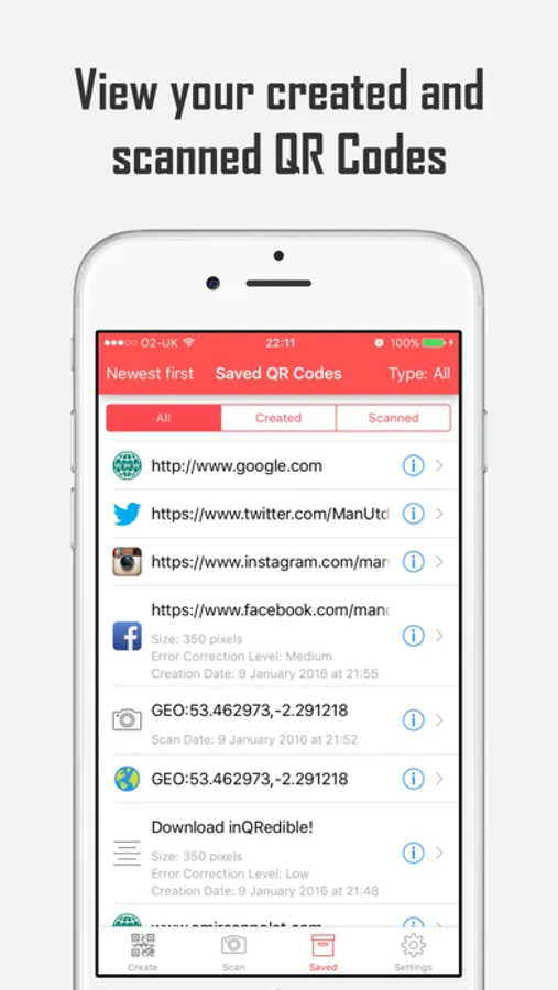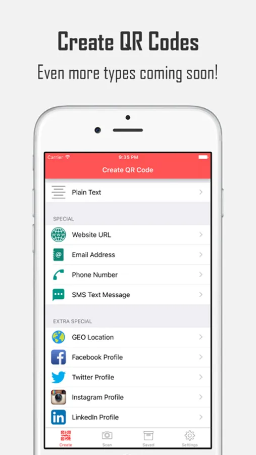 Create QR Codes! This includes plain text, website URLs, email addresses, phone numbers, SMS messages, locations and more! You can also create QR Codes for your Facebook, Twitter, Instagram and LinkedIn profiles. When these are scanned with inQRedible, your profiles will be launched in their respective apps!
