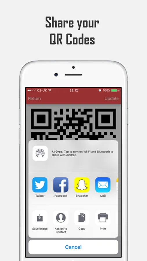 • Share your QR Codes with Facebook, Twitter, Snapchat, Mail and more!