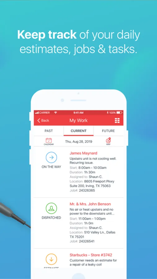 View your daily schedule, update statuses of jobs and estimates, create new ones, view customer details, service agreement terms and details, inventory stock levels in multiple warehouses/vans/trucks + more.