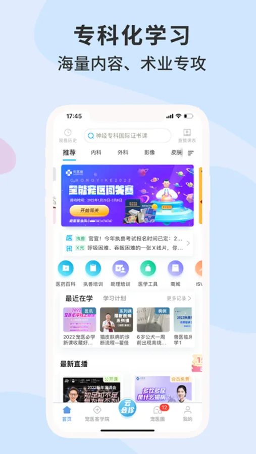 体系化课程: 宠医客学苑板块每月线上直播名师课程,累计数2300+ 节精品课程,每月持续更新18节以上新课程。拥有5大医生成长阶段晋升学习、10大专科系统课程清单、20个全科医生学习专题以及配套考核证书等,从临床小白到主治医生的一站式学习。