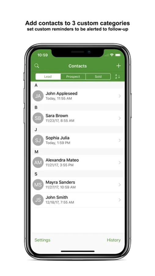 This app allows you to organize your contacts in 3 categories. The defaults are Lead, Prospect, Sold.