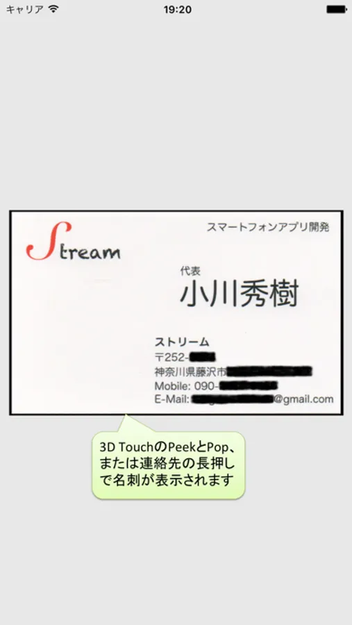 3D Touchに対応した端末では、連絡先一覧画面から3D Touchのピーク、ポップを使用して名刺の表示ができます。