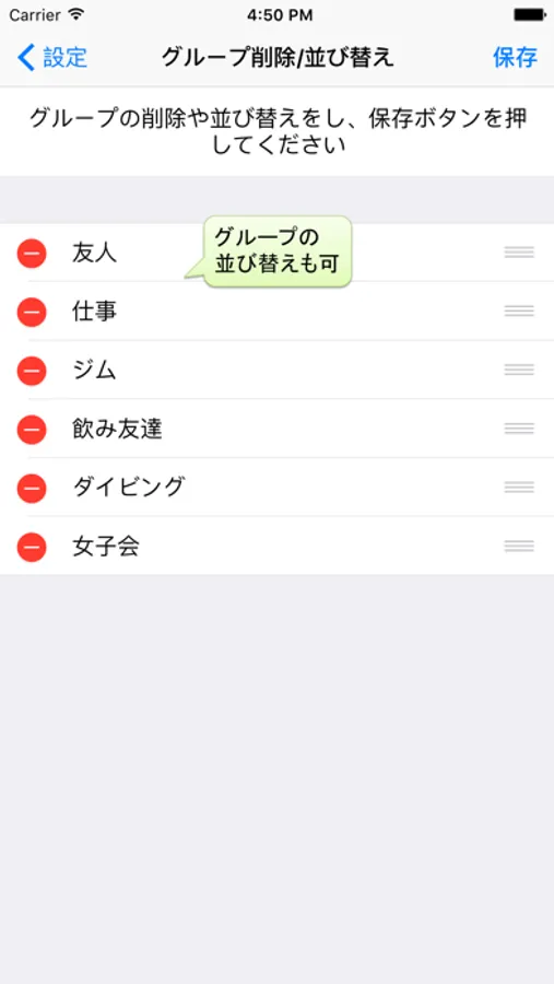 連絡先の追加・削除、グループの追加・削除・並び替え、グループメンバーの編集もできます。