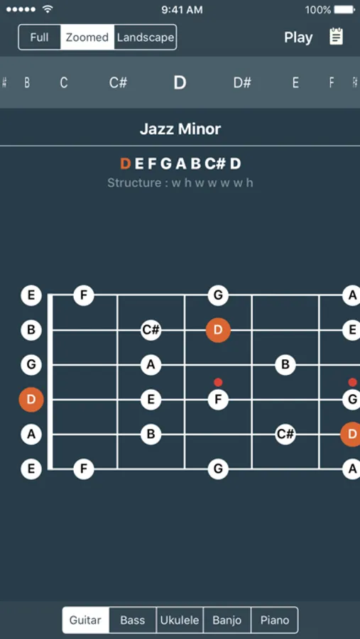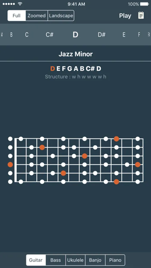 Scales library for guitar, ukulele, bass guitar, piano and banjo!.