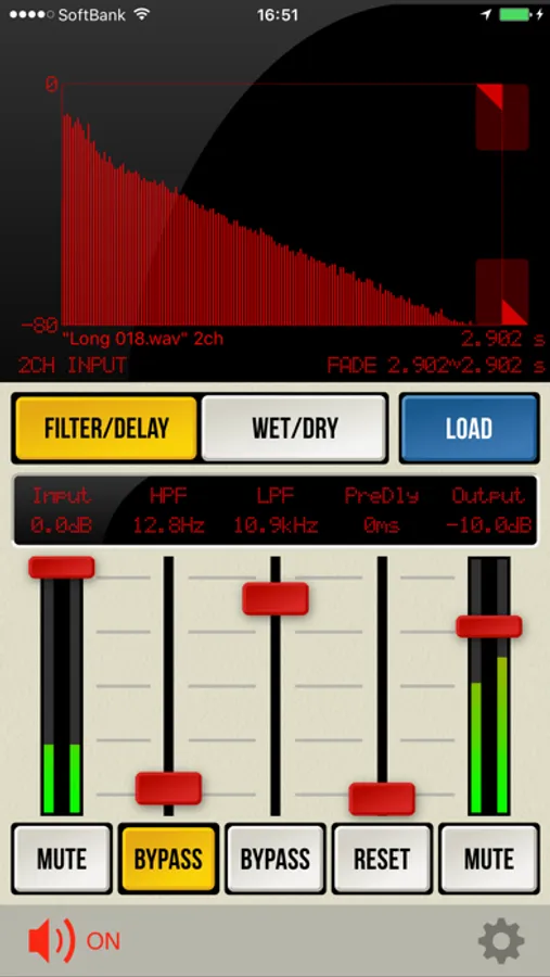 Convolution is an effect that adds sampled reverberative properties to a sound to recreate the original properties of that sound. The data of these reverberative properties are called the Impulse Response(IR), and can record the properties of not only acoustic space but also from such things as hardware and speakers. By recording the properties of reverberation from acoustic spaces such as halls and studios, high grade hardware reverb, spring reverb, speaker cabinets and microphones, etc. to Impulse Response files, they can be reproduced in iConvolver.