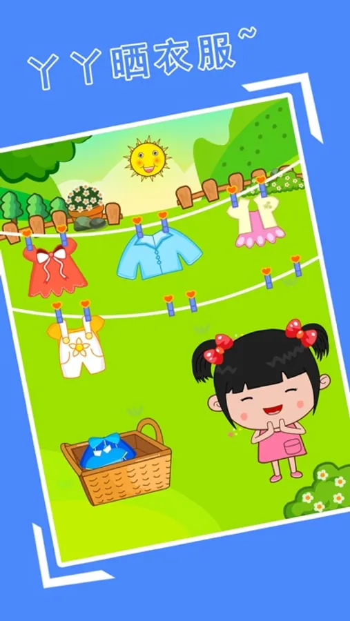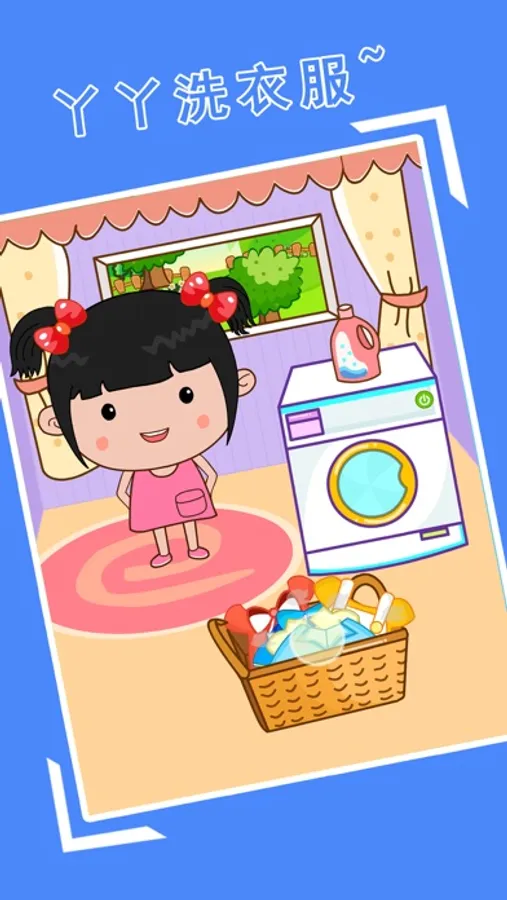 丫丫小朋友会洗衣服喽,丫丫小朋友在游戏的语音和图形的指导下学洗衣服,晾衣服,叠衣服。游戏画面简单可爱,语言清晰,小朋友在游戏中体会做家务和过家家的乐趣,在自己动手的过程中创作快乐!