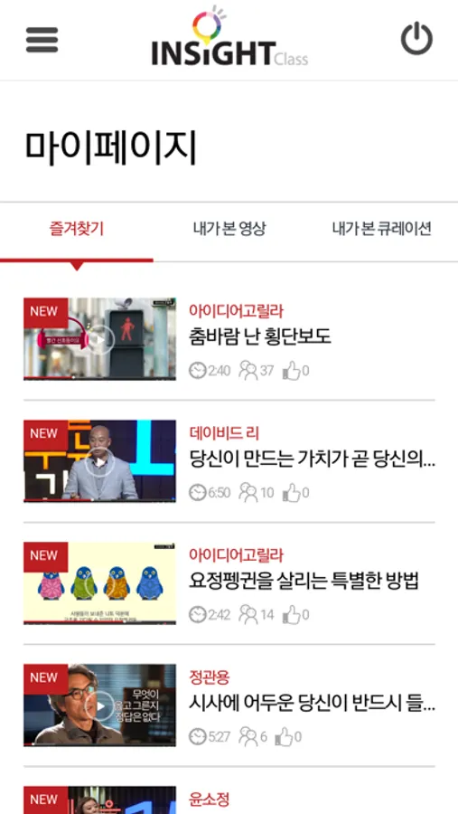 좋아요, 즐겨찾기, 내가 본 영상, 내가 본 큐레이션