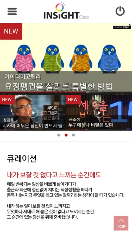 TED, 세바시, 아이디어고릴라, 성장문답, 꼴통쇼 등 다양한 오픈소스 컨텐츠 서비스를 큐레이션을 통해 트렌드, 재미, 지혜를 제공하는 KG에듀원의 부가서비스!