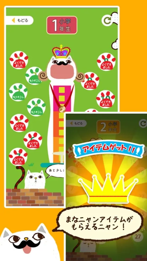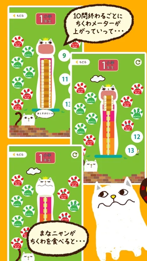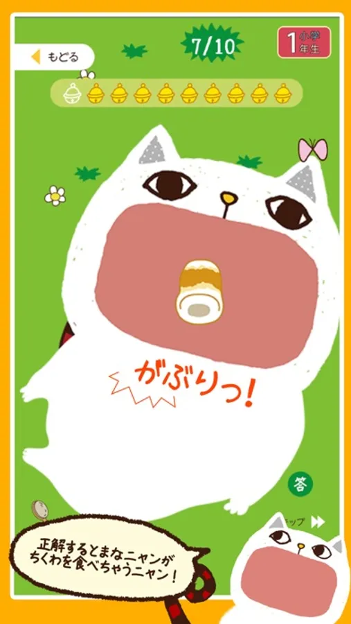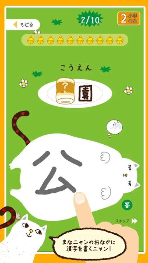 メニューは学年ごとに分かれていて、1回につき10問を出題。1問ずつ出される漢字を、まなニャンのおなかに書いていきます。正解の場合はまなニャンがちくわを食べることができて満足、不正解の場合はちょっと不機嫌です。1問につき10秒の持ち時間内で答えましょう。時間は並んだ鈴が知らせてくれます。