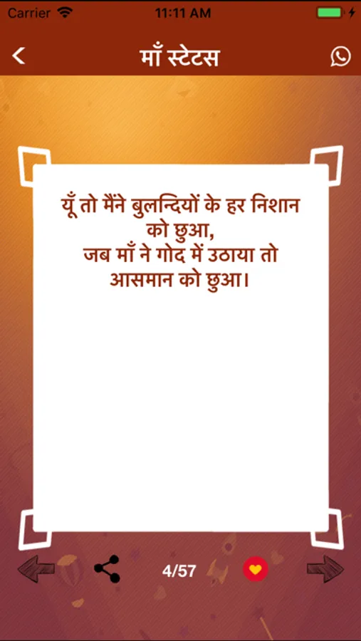 This app brings you the best collection of mother shayari & Mother Status in hindi. Beautiful poem on mother in hindi. These shayari on mother can be sent as an SMS to mobile or as a WhatsApp message or it can also be used as a new WhatsApp image status.