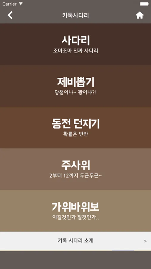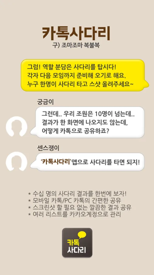 "사다리 for Kakao" 는 최대 100명 까지의 사다리 결과를 카카오톡으로 공유할 수 있게 해 주는 재미있는 복불복 앱 입니다.